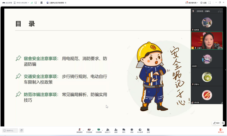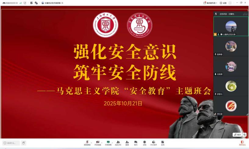 为切实强化研究生安全防护意识,筑牢校园安全防线,10月21日晚,上海理工大学马克思主义学院2023级研究生班级以线上形式举办“强化安全意识,筑牢安全防线”主题班会。本次班会紧扣研究生学习生活核心安全需求,从学术、生活、网络三大维度切入,结合真实案例深入剖析论文保密、实验室操作规范、宿舍用电安全、电信诈骗防范等关键风险点,明确“预防为先、应急有方”的安全工作原则。班会由2023级研究生班级班长左馨冉主持,马克思主义学院党委副书记吴军及班级全体研究生参加。