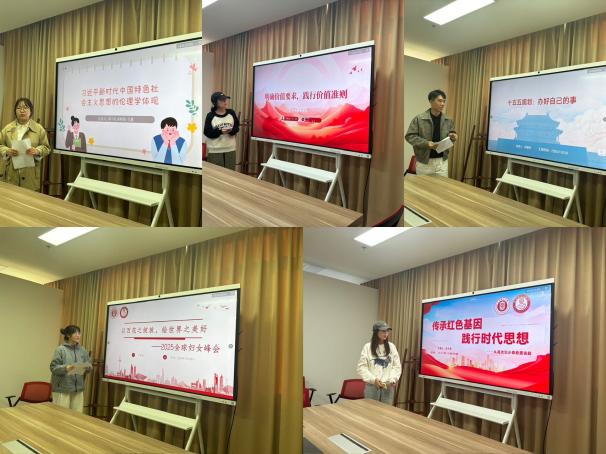 随后,研习社新成员依次进行交流展示。有同学就习近平新时代中国特色社会主义思想的伦理学体现展开交流;也有同学向大家讲述了新时代青年应该明确的价值要求和践行的行为准则;还有同学将“十五五”规划与新时代青年的个人命运相结合,在时代坐标中定位个人奋斗的方向,体现了将个人命运融入国家发展的宏观视野。除此之外,大家还围绕2025全球妇女峰会、传承红色基因等主题展开宣讲。此次活动,不仅是一次经验的传递,更是一次思想的碰撞和洗礼。