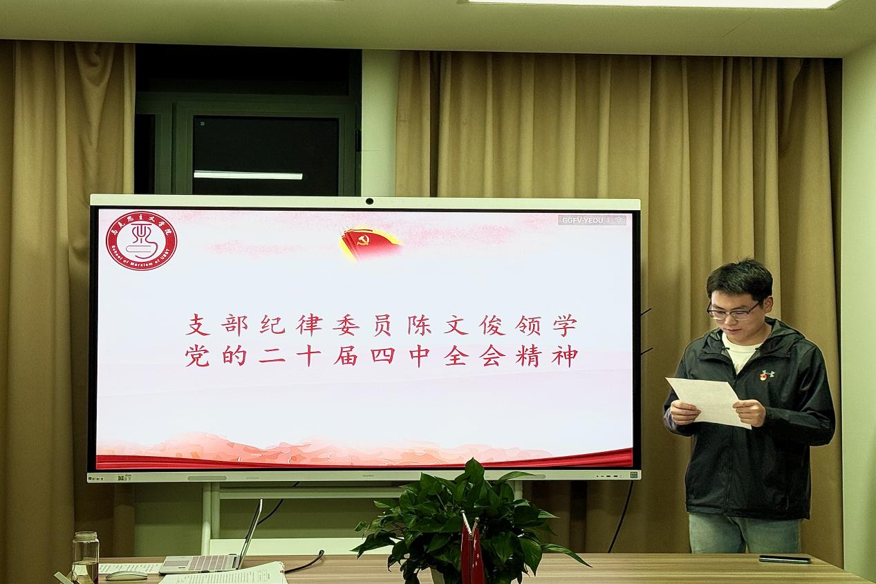 随后,支部纪律委员陈文俊带领全体党员学习贯彻党的二十届四中全会精神。他指出,二十届四中全会是在我国进入全面建设社会主义现代化国家新阶段、向第二个百年奋斗目标迈进的重要时刻召开的。他重点讲解了“十五五”时期经济社会发展的总体目标、主要任务和重点举措以及在党的建设、社会建设、文化建设方面的会议要求。最后他总结到,学习、理解和贯彻全会精神,是当前重要的政治任务,应认真学习文件内容,结合实际工作深化理解,把思想和行动统一到党中央的决策部署上来。