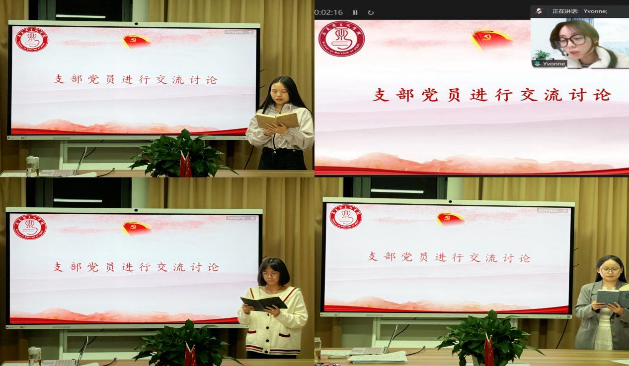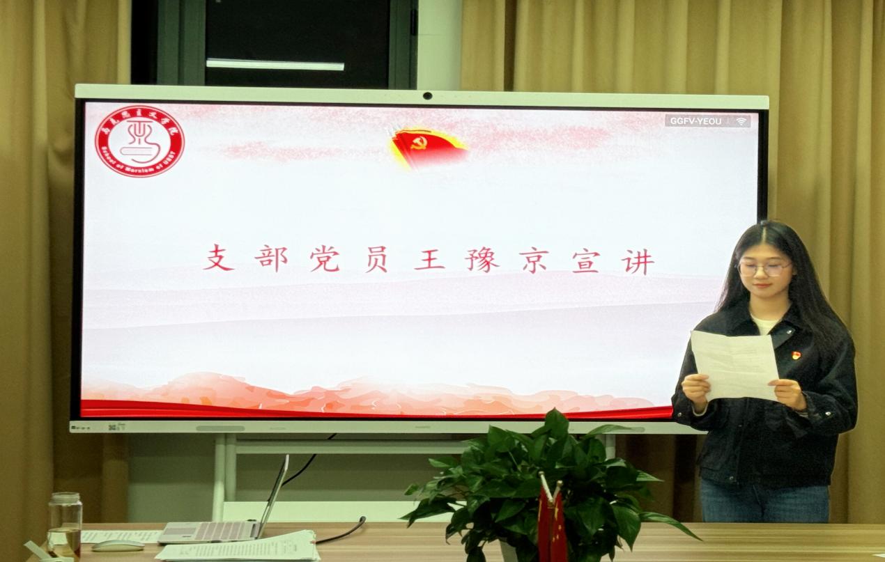 交流研讨环节中,支部党员汤亦曦、商悦雯、张新、张晓雨围绕“庆华诞征程万里,守初心逐梦前行”主题踊跃发言。大家纷纷结合共产党员的初心使命以及专业特点发表感想,他们表示,要将个人理想融入国家发展大局,认真学习党的二十届四中全会精神,在阐释党的创新理论、传播红色文化中以专业学识回应时代之问。