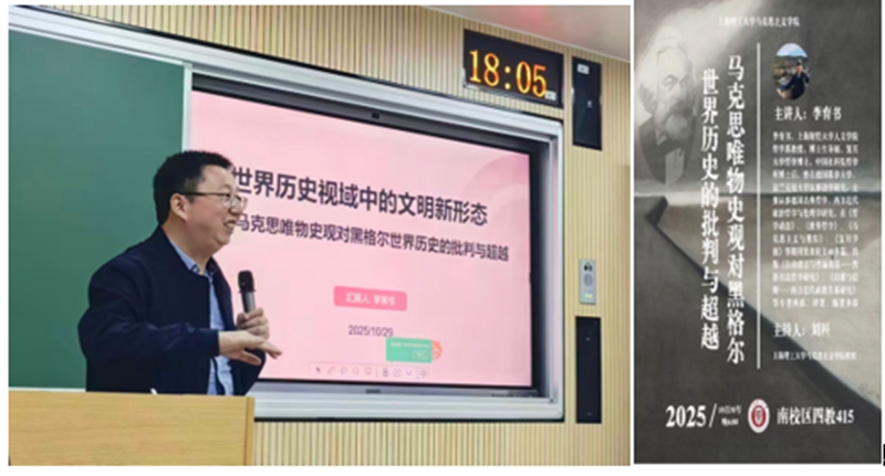 为系统提升马克思主义理论学科研究生培养质量,夯实学术创新根基,2025 年 10 月 30 日晚 18 时,上海理工大学马克思主义学院在南校区第四教学楼319教室成功举办专题学术讲座。本次讲座特邀上海财经大学人文学院哲学系教授、博士生导师李育书主讲,以世界历史视域中的文明新形态为主题,深入探讨了马克思唯物史观对黑格尔世界历史理论的批判与超越。讲座由上海理工大学马克思主义学院教授刘科担任主持,学院在校研究生及部分骨干教师参会。