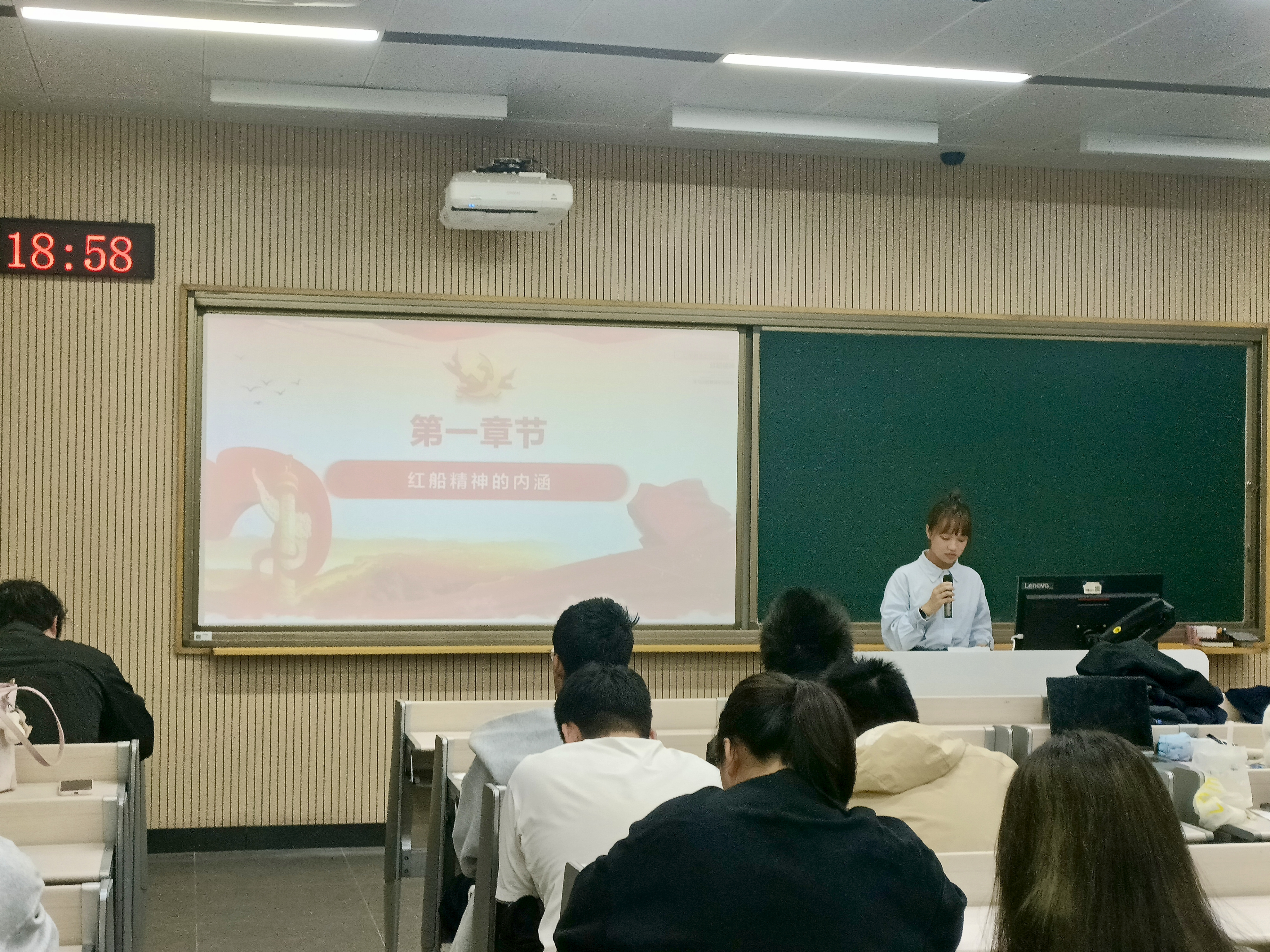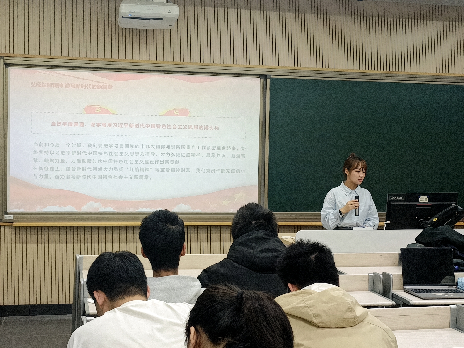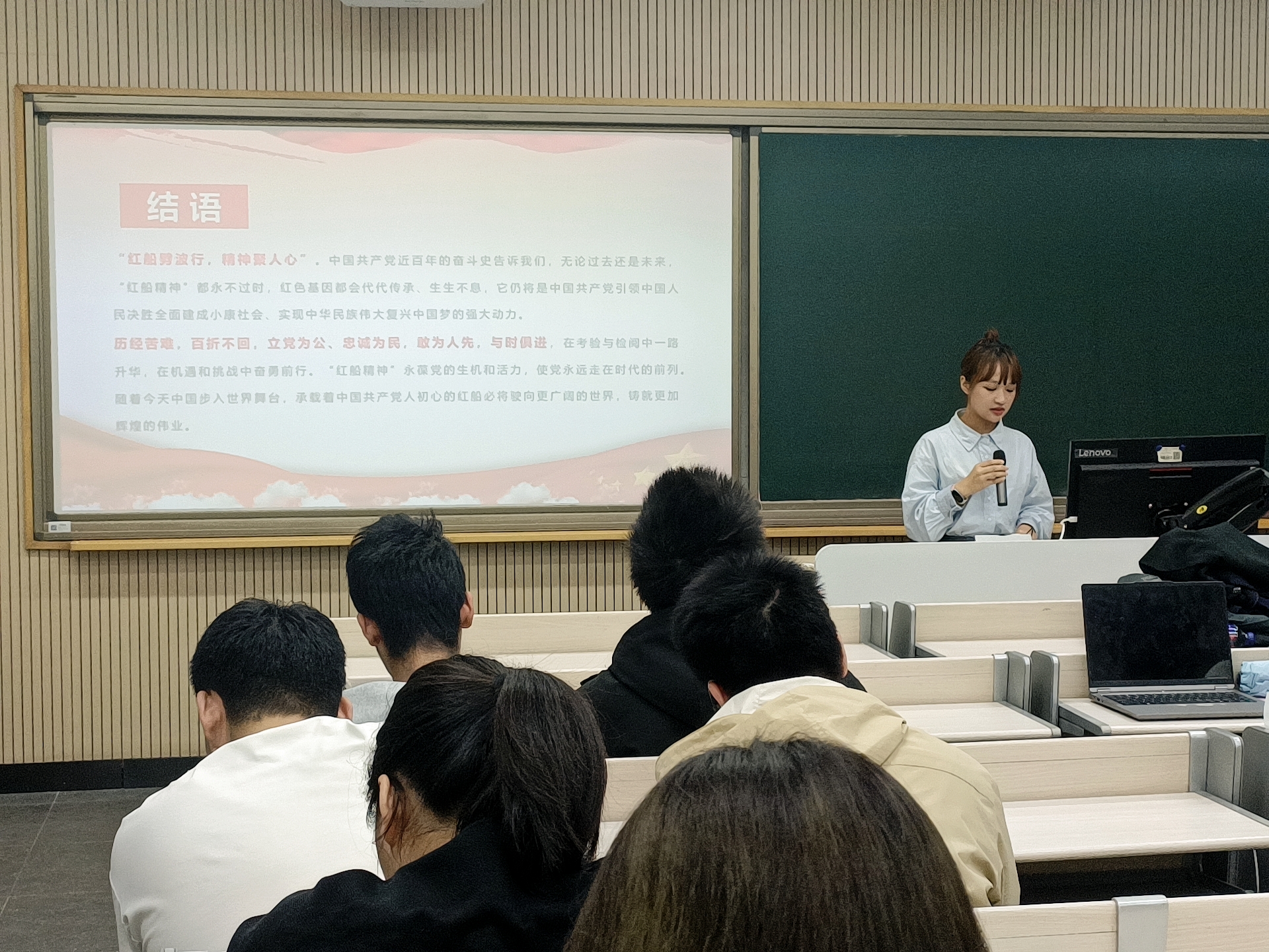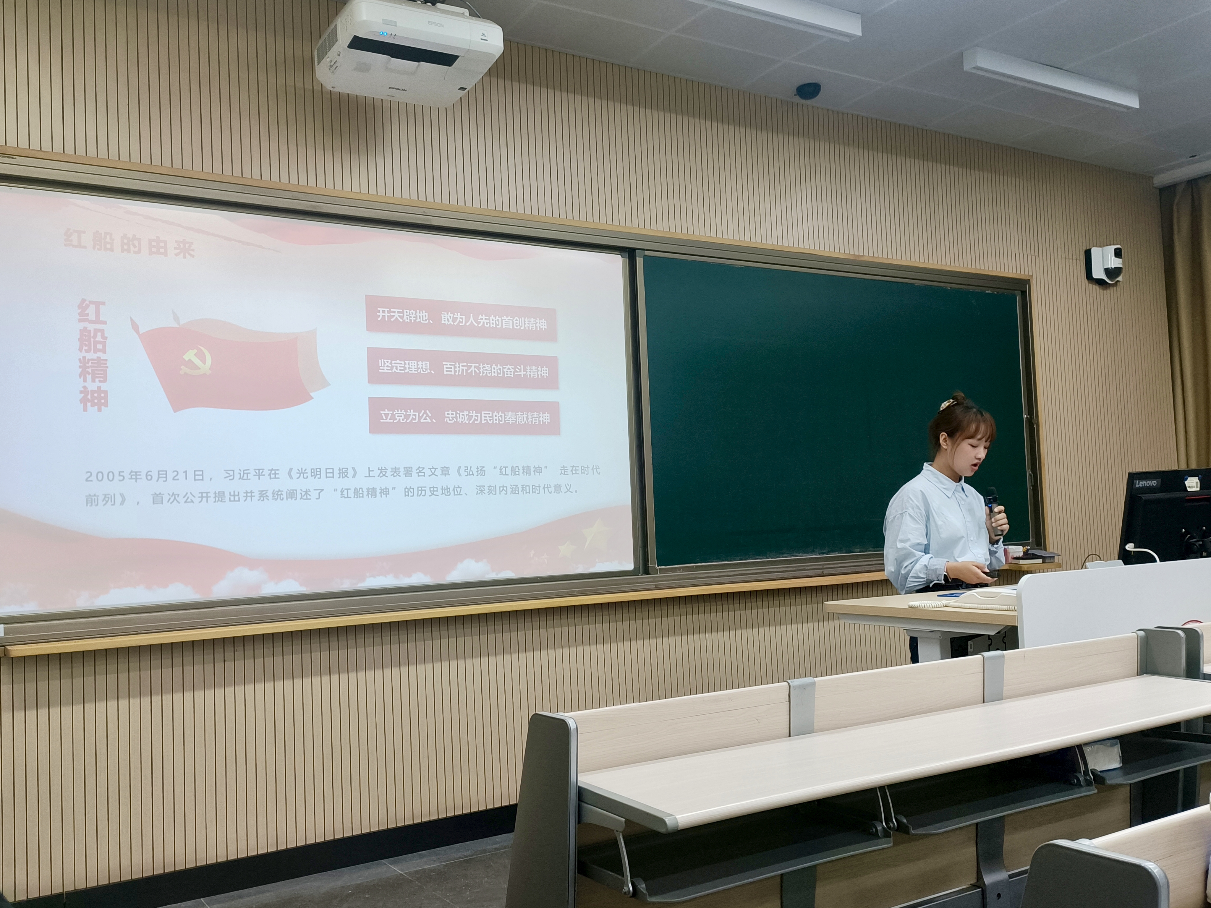 在第三部分“弘扬红船精神 谱写新时代的新篇章”中,她号召全体同学要深入学习贯彻习近平新时代中国特色社会主义思想,牢固树立“四个意识”,坚决维护习近平总书记党中央的核心、全党的核心地位,坚定不移听党话、跟党走,在庄严的氛围中凝聚起“红船劈波行,精神聚人心”的强烈共鸣。
