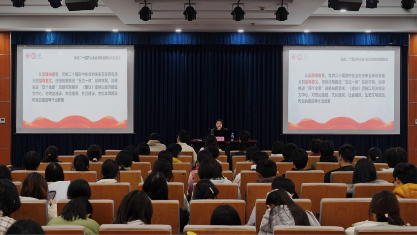 宣讲伊始,朱喆同学围绕“全会召开背景与重要意义”展开。从“每届七次全会的功能逻辑”讲起,梳理了从一中全会到七中全会“组织奠基-人事准备-改革破局-制度巩固-规划未来-精神凝聚-收官筹备”的递进关系,说明党的二十届四中全会在党的二十届中央委员会任期中的关键地位。随后,她从国内发展阶段和国际环境两个维度,重点阐释了在“十四五”规划收官与“十五五”规划谋划衔接的关键时期,如何科学应对现代化建设阶段性任务和改革发展现实紧迫性;并从历史厚度、时代高度、理论深度、实践向度和世界意义等方面,系统解读了此次全会在推进中国式现代化进程中的深远影响。
