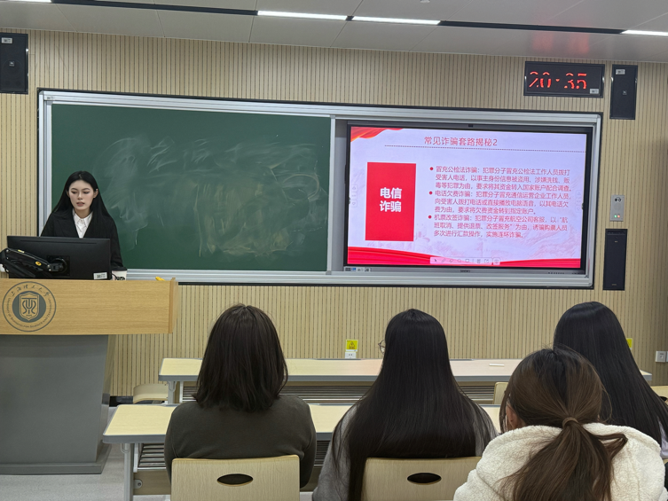 本次活动围绕“现状盘点—套路揭秘—案例警示—攻略速递—倡议践行”五大环节有序展开,将理论科普与实践指引深度融合。活动伊始,团支书项佳慧结合权威数据,向大家清晰呈现校园诈骗“针对低经验学生、依托网络技术、案发于日常场景”的三大特点,让大家第一时间树立起反诈紧迫感。