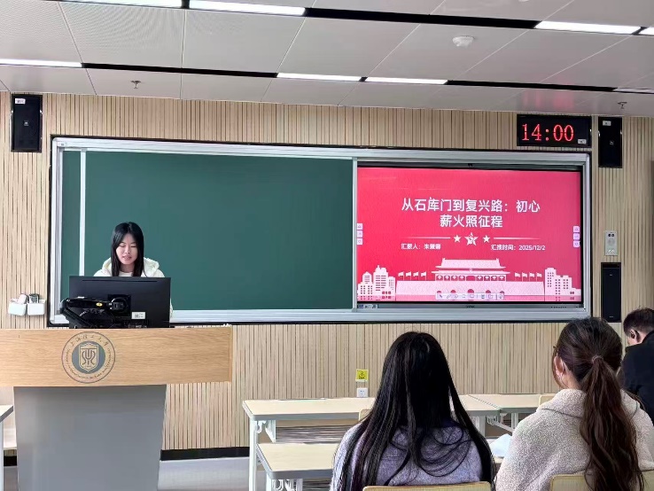 典礼伊始,由党校学员代表朱慧卿同学向全体成员进行培训心得的汇报展示,她将自己在参观中共一大会址后的感悟进行了主题为“从石库门到复兴路:初心薪火照征程”的分享。朱慧卿同学提到,石库门是理解中国式现代化的历史原点与精神标尺,从望志路106号一楼的那张小书桌开始,党始终坚守初心与使命,为人民谋幸福,为民族谋复兴。这一初心使命延续至了今日,党的二十届四中全会升级了党对自身的治理范式,以更加优良的作风坚持以人民为中心,为全面建设社会主义现代化国家、全面推进中华民族伟大复兴奋勇前进。