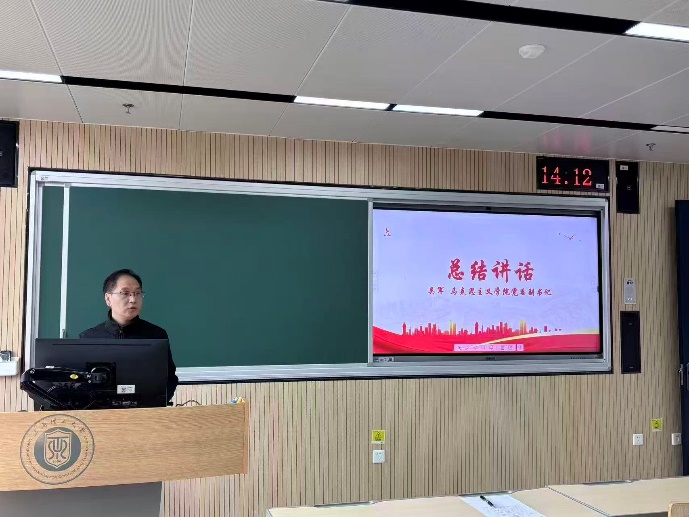 最后,马克思主义学院党委副书记吴军作总结讲话。吴书记首先对获得表彰的小组和学员表示祝贺,随后作出几点期待与强调,一是希望各位学员要牢记申请入党的初衷,持续强化成为一名优秀共产党员的信念和使命。二是要积极参与各项实践活动,把握好研究生这一关键成长期,全面提升自我。三是要主动学习弥补不足,寻找自身短板,拓宽视野,深入学习党的理论知识,用实际行动践行党的宗旨与使命。