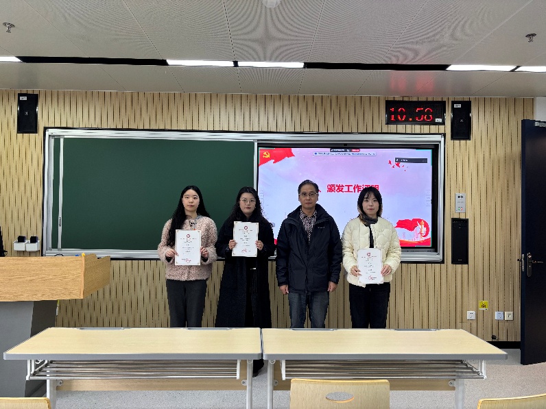 最后,学院党委副书记吴军为上一届支部委员会颁发工作证明并作总结发言,对新接受的预备党员表示祝贺,对当选的新一届支部委员会成员表达期望,同时充分肯定了上届支部委员会的辛勤付出与工作成效。