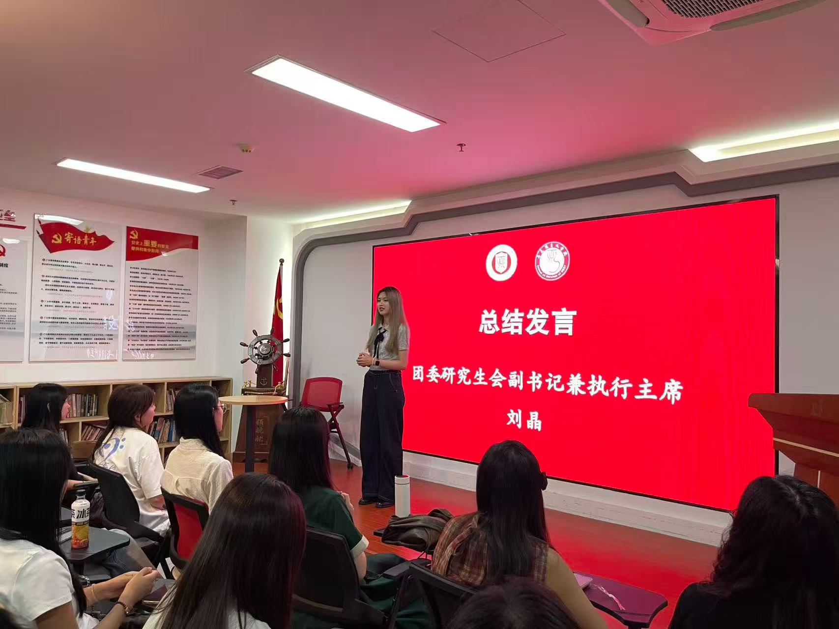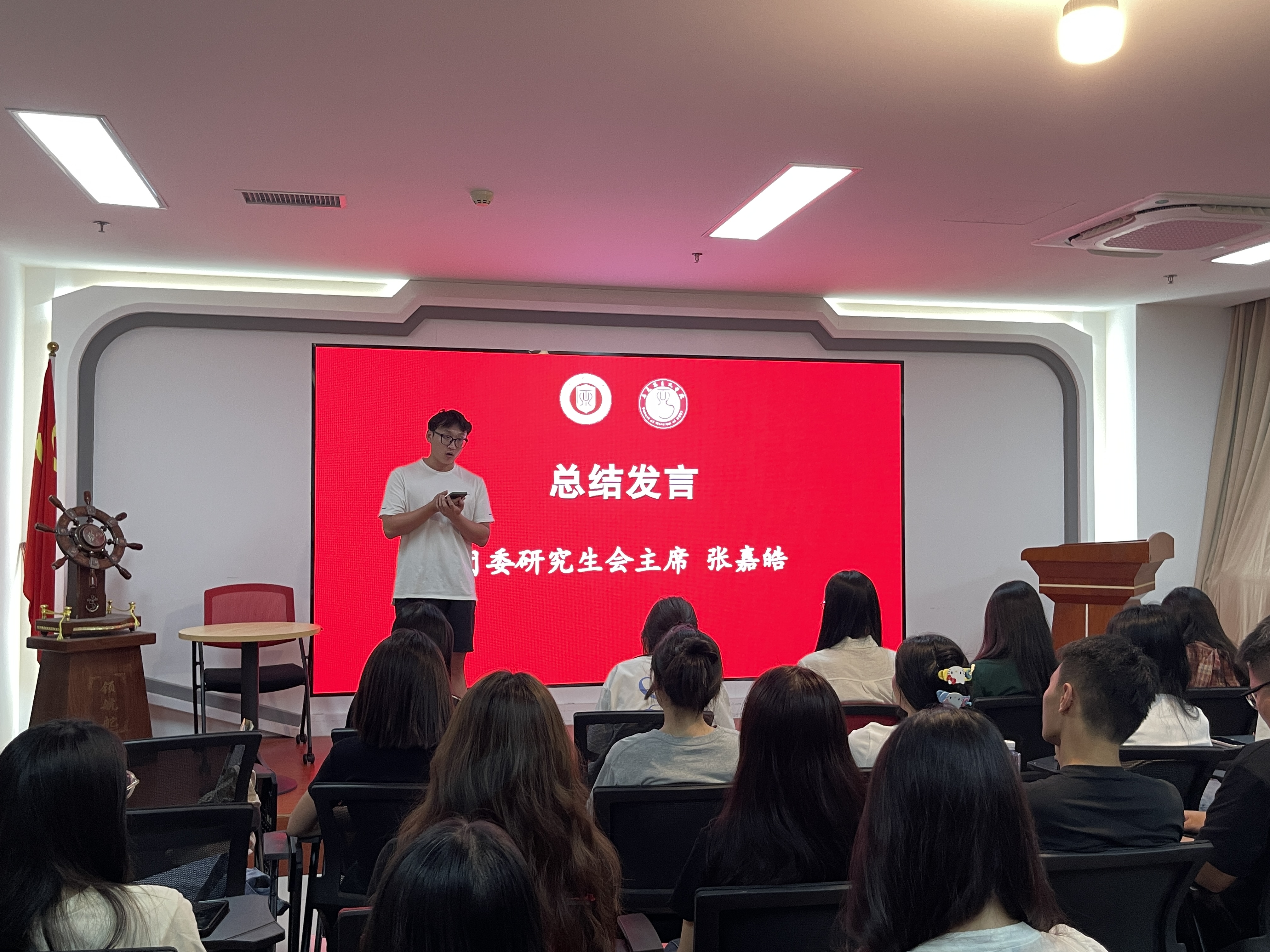 接着,学院团委副书记兼研究生会执行主席刘晶作总结发言。她首先对同学们积极支持并配合学校和学院的各项工作表示高度肯定,并对大家始终保持的饱满热情和务实态度深感欣慰。她鼓励2025级新生踊跃参与即将开展的班委竞选和研会各部门招新,主动抓住锻炼能力、拓展视野的宝贵机会,在实践中锤炼真本领、增长新才干。她强调,每一位同学都是马克思主义学院大家庭的重要一员,希望大家以主人翁的姿态融入集体、服务同学、提升自我,共同为学院的建设和发展注入新活力、贡献新力量。