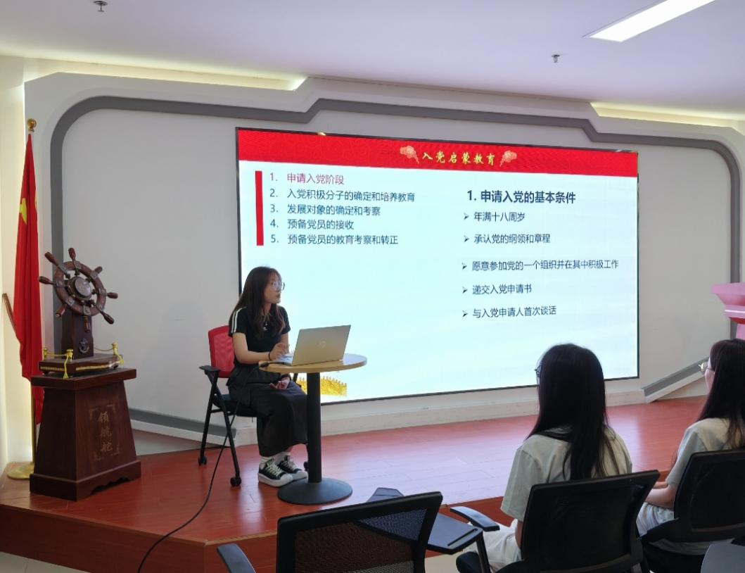 随后,支部宣传委员陈红结合支部组织工作规范,着重强调了入党流程的严谨性,针对申请入党、入党积极分子确定、发展对象考察、预备党员接收及转正等各个阶段的具体要求和注意事项进行了细致说明。她希望大家可以积极主动参与党支部组织的各类学习研讨、志愿服务和主题实践等活动,鼓励新生们珍惜实践机会,努力成长为有理想、敢担当、能吃苦、肯奋斗的新时代青年党员。