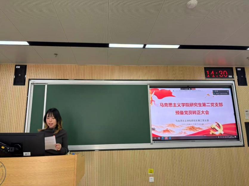 为严格党员发展程序、传承红色革命精神,2025年12月26日,马克思主义学院研究生第二党支部于第四教学楼303室召开预备党员转正大会暨十二月主题党日活动,支部全体党员参会。