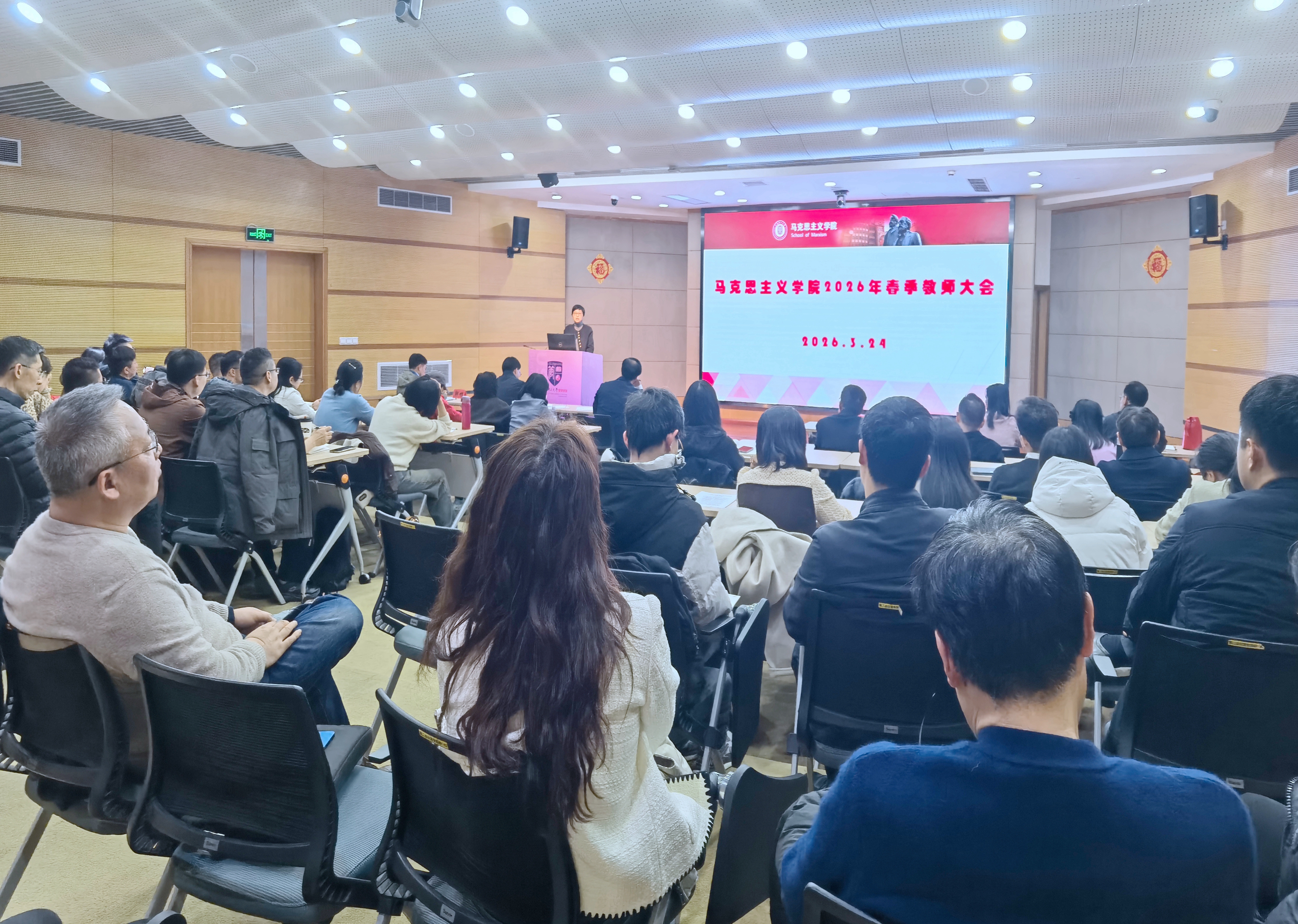 2026年3月24日下午,上海理工大学马克思主义学院2026年春季学期全院教师大会在经管A楼第二会议室召开。校党委副书记贺莉出席,学院党政班子及全体教师参会,马院党委书记彭宗祥主持会议,会议紧扣学校“重服务、强贡献”导向,全面部署新学期重点工作。